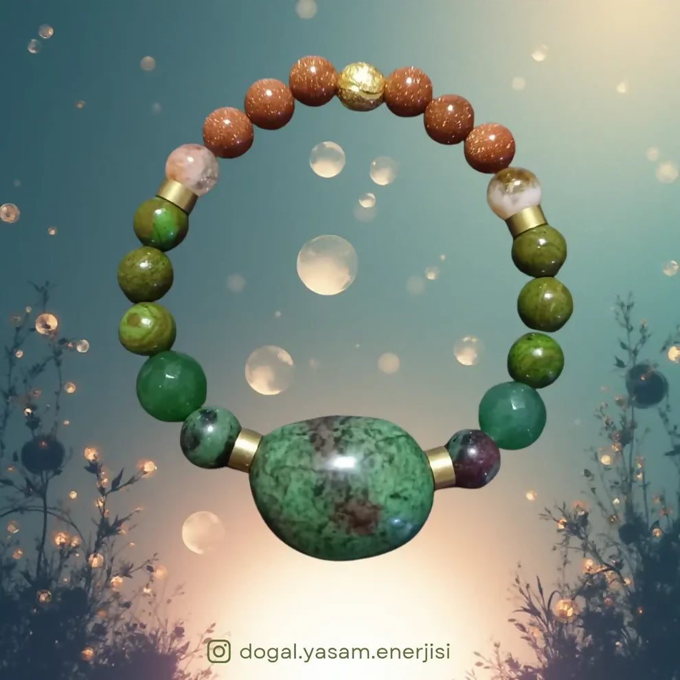 Tasarımın kalbinde yer alan Rubi Zoisit, büyüleyici desenleriyle stilinize sanatsal bir derinlik katarken; Unakit ve Aventurin'in dingin dokusu bu enerjiyi dengeler. Tasarımı tamamlayan Sitrin ve Yıldız Taşı'nın kendinden ışıltılı yapısı ise her adımda size neşeli bir parıltı ve modern bir şıklık sunar. Hem göz alıcı hem de ruhu besleyen bu bileklik, sıradanlıktan uzak, özgün bir tarz arayanlar için tasarlandı.