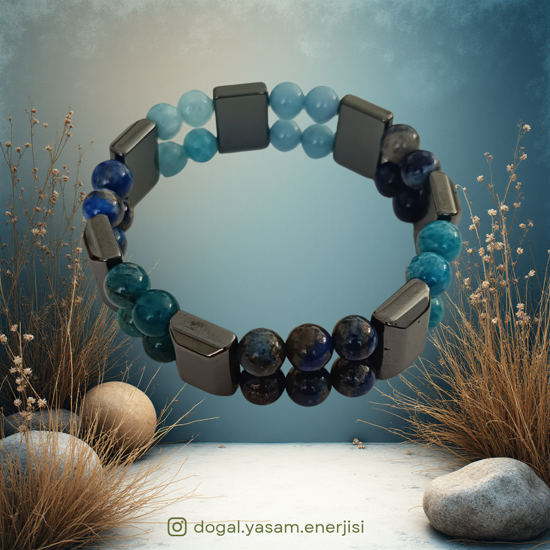 Lapis lazuli, apatit, sodalit, akuamarin ve hematit taşlarının güçlü birlikteliğiyle hazırlanan bu çift sıralı erkek doğal taş bileklik, maskülen şıklığı zihinsel berraklık ve kararlılık sembolleriyle birleştiriyor. Metalik gri tonlarındaki hematit taşlarının sağlam ve dik duruşu, mavinin en asil tonlarını taşıyan taşlarla harmanlanarak modern erkeğin stilini tamamlayan karizmatik bir aksesuar oluşturuyor. Odaklanma, mantıklı düşünme ve irade temalarıyla özdeşleşen bu özel tasarım, hem yoğun iş temposunda hem de günlük kullanımda sarsılmaz bir öz güven ve dinamik bir görünüm sergilemek isteyenler için idealdir. Çift sıralı yapısı sayesinde bilekte karakteristik bir duruş sergileyen bu parça, doğal taşların kendine has dokusuyla her kullanıcıya özel bir benzersizlik sunarken; kaliteyi, estetiği ve anlamlı bir tasarımı bir arada arayan beyler için en seçkin hediye alternatiflerinden birini oluşturuyor.