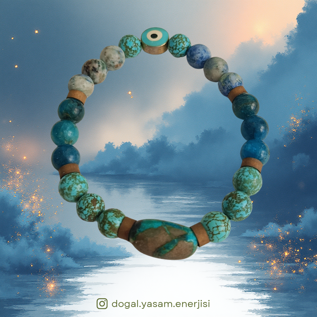 Nişabur firuzesinin asaletini ve mavinin en derin tonlarını bir araya getiren bu özel tasarım bileklik, stilinize hem zamansız bir şıklık hem de karakteristik bir duruş katmak için hazırlandı. Tasarımın kalbinde yer alan ve nadide bir parça olan Nişabur firuzesi, kadim geleneklerden günümüze asalet ve öz güvenin sembolü olarak taşınırken; lapis lazuli, apatit ve sodalit taşlarının uyumlu birlikteliği zihinsel bir berraklığı ve estetik bir bütünlüğü simgeler. Modern çizgilerle doğal dokunun harmanlandığı bu parça, kendini ifade etme gücünü ve asil bir tarzı ön plana çıkarmak isteyenler için ideal bir aksesuardır. Doğal taşların kendine has damar yapıları ve renk tonları sayesinde her bir bileklik tamamen eşsiz olup, günlük kombinlerinizde fark yaratacak bir detay sunar. Hem kendiniz için seçkin bir aksesuar hem de sevdikleriniz için anlamlı ve kalıcı bir hediye seçeneği olan bu özel tasarım, doğanın ve bilgeliğin asaletini her an bileğinizde hissetmenizi sağlar.